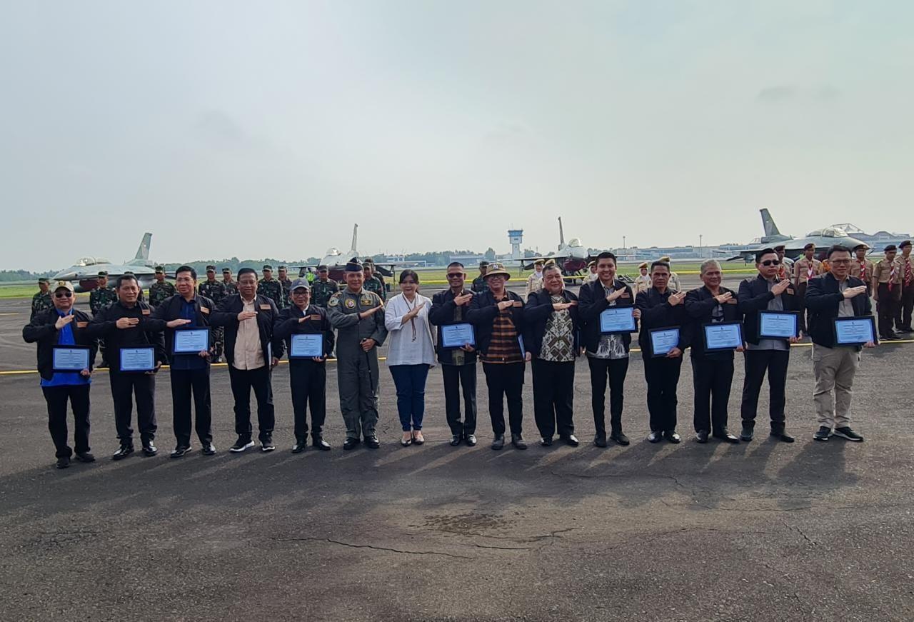 Palembang – Komandan Lanud Sri Mulyono Herlambang Palembang Kolonel Pnb Sigit Gatot Prasetyo, M.M.O.A.S., berikan Piagam Penghargaan dan pemasangan jaket sebagai keluarga kehormatan Lanud Sri Mulyono Herlambang kepada pejabat Provinsi Sumsel dan Forum Koordinasi Pimpinan Daerah (FKPD) Kota dan Kabupaten se-Sumatera Selatan (Sumsel) bertempat di apron Alpha Mako Lanud SMH, Minggu (28/5/2023).