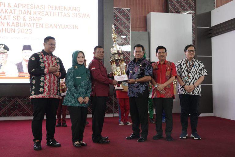 Sekaligus Bupati juga Menutup serta Penyerahan dan Apresiasi Pemenang Pembinaan Kreatifitas Siswa Tingkat SD dan SMP di ajang OSN, O2SN dan FLS2N Kabupaten Banyuasin Tahun 2023, di Graha Sedulang Setudung Pemkab Banyuasin, Kamis (22/06).