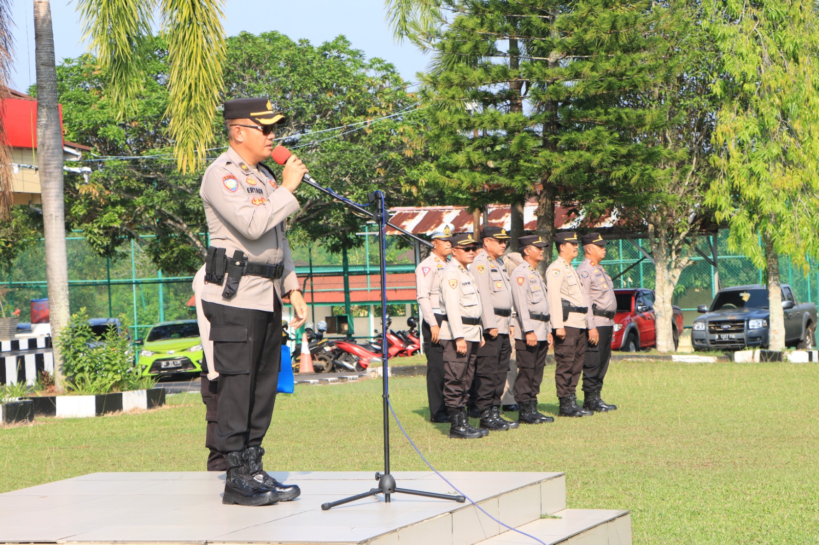 Banyuasin – Mewakili Kapolres Banyuasin, Kabag Ren Polres Banyuasin Kompol Eryadi Yuswanto SH MH Pimpin Langsung Apel Pagi di Halaman Mapolres Banyuasin, Rabu (8/11).