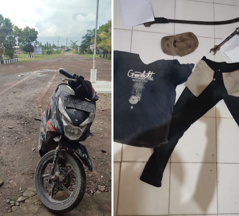 “Barang bukti yang berhasil disita dari pelaku berupa 1 unit sepeda motor honda beat bewarna hitam, 1 bilah parang dengan panjang 50cm, 1 helai jeans bewarna hitam, 1 helai baju kaos biru, 1 buah topi bewarna coklat , 1 buah kunci pas ukuran 24 dan 1 buah kunci pas berukuran 22, “tandas dia (Adm)
