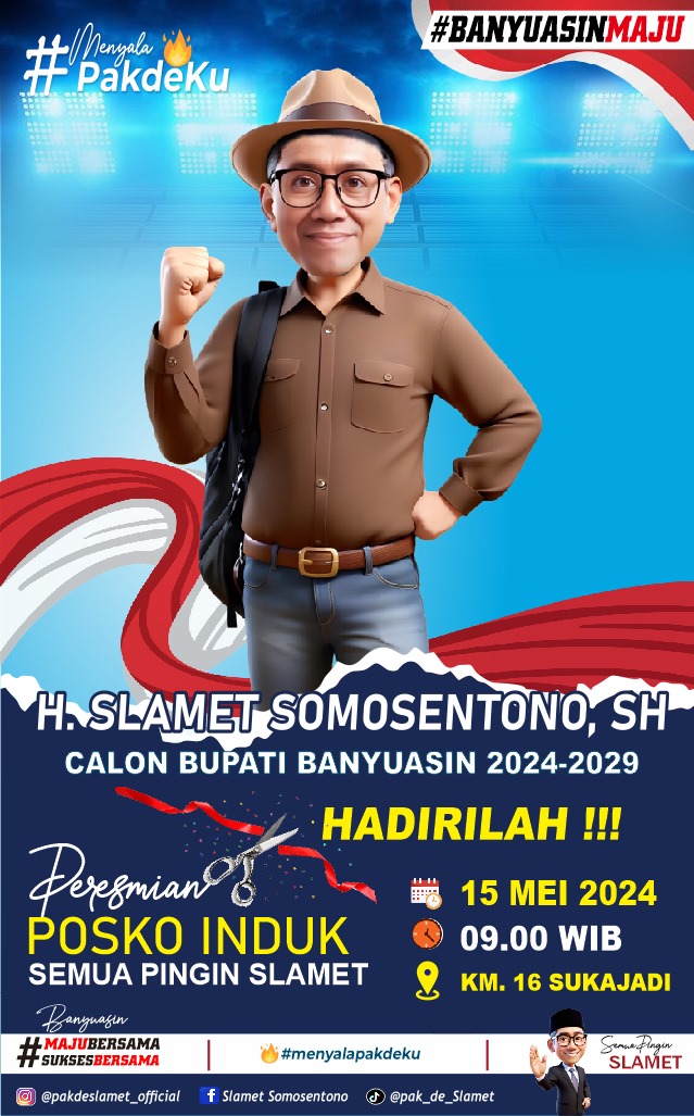 Banyuasin – Posko Induk pemenangan Pakde Slamet Calon Bupati Banyuasin, diresmikan besok, Rabu 15 Mei 2024. Peresmian posko induk ini akan dilakukan oleh Pakde Slamet Calon Bupati Banyuasin, bersama Tim Pemenangan, pengurus partai, sayap partai dan relawan serta tokoh-tokoh.