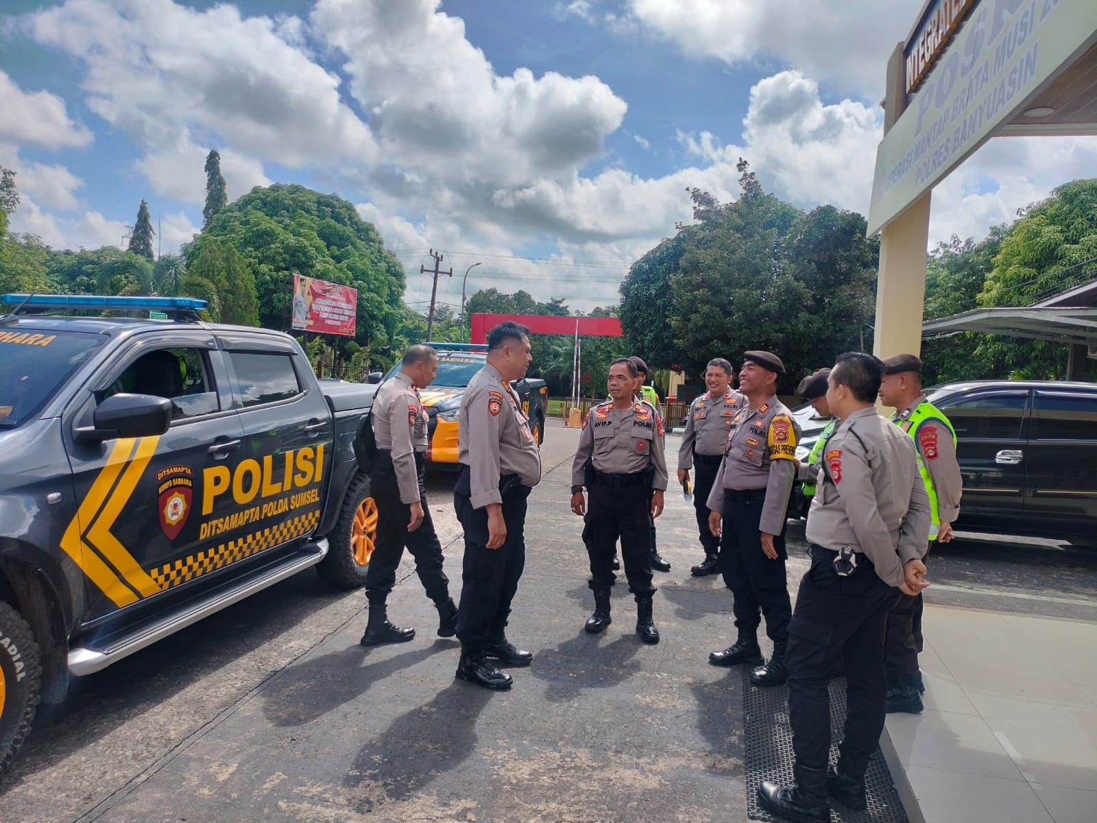 AKP Vetria Sukri SH selaku Kasat Samapta Polres Banyuasin menyambut langsung team dari polda sumsel tersebut di depan gedung Command Center Polres Banyuasin, Senin (13/5)