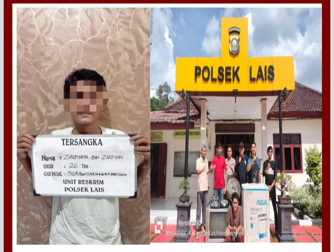 Muba – Zalpi Heri (26) tahun seorang petani, warga Dusun V Desa Teluk Kijing II Kecamatan Lais, Kabupaten Musi Banyuasin diringkus Tim Unit Reskrim Polsek Lais. Ia diringkus atas dugaan tindak pidana pencurian dengan pemberatan di rumah korban Nasrullah pada hari Senin, 21 Agustus 2023 sekira pukul 03.00 WIB, dirumah korban di Dusun IV Desa Teluk Kijing II, Kecamatan Lais.