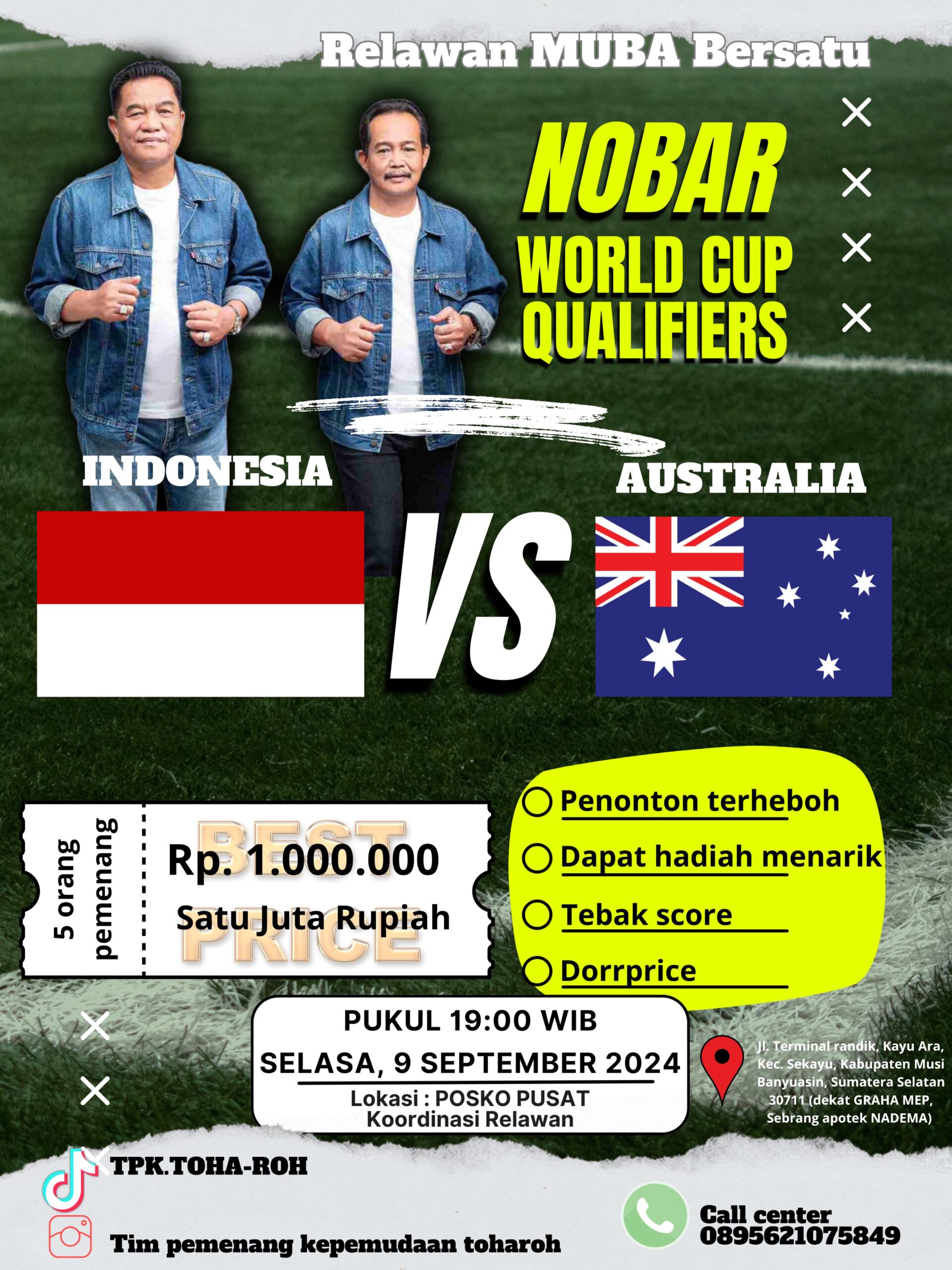 Muba – Tim Relawan Muba bersatu bersama H M Toha Toha tohet-Kyai Rohman gelar nonton bareng kualifikasi piala dunia pertandingan Timnas Indonesia Vs Australia. Nobar tersebut digelar bertempat lokasi posko pusat koordinasi relawan pada malam ini, Selasa (10/09/2024) Pukul 19.00 Wib.