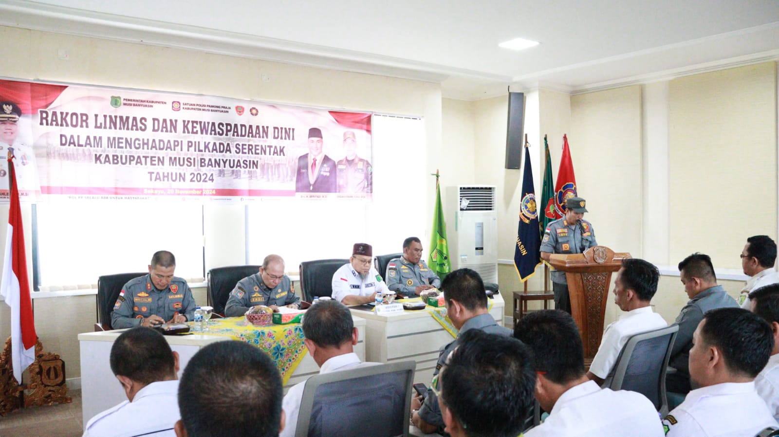 Muba – Menjelang Pilkada Serentak 2024, Pemerintah Kabupaten Musi Banyuasin (Pemkab Muba) melalui Satuan Polisi Pamong Praja (SatPol PP) mengadakan Rapat Koordinasi (Rakor) Linmas dan Kewaspadaan Dini untuk memastikan wilayah Kabupaten Muba tetap aman dan kondusif, Rabu, (20/11/2024) berlangsung di Ruang Rapat Ranggonang Lt.3 Setda kabupaten Muba.