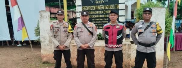Misa Natal tersebut berjalan aman dan lancar, Personil Polsek Muara Padang Polres Banyuasin Aipda Reza Fahlefi dan Brigpol Mudiyarto melakukan penjagaan dan pengamanan (PAM) di lokasi Gereja Kristen Sumatera Bagian Selatan tersebut, Selasa (24/12).