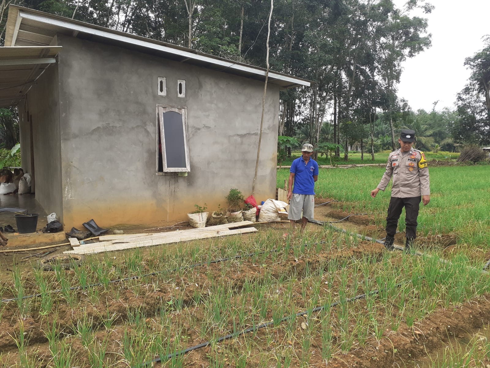 BANYUASIN – Bhabinkamtibmas Polsek Mariana, Polres Banyuasin Brigpol Havez Rinaldo melaksanakan pengecekan lahan di Pekarangan rumah bapak Zainal di Desa Tirtosari Kecamatan Banyuasin I, yang ditanami bawang guna mendukung program ketahanan pangan pemerintah, Selasa (25/2).