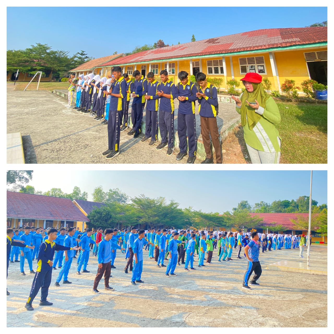 Kegiatan dimulai dengan menyanyikan lagu Indonesia Raya, doa bersama, serta senam “Anak Indonesia Hebat” yang diikuti seluruh siswa dan dewan guru.