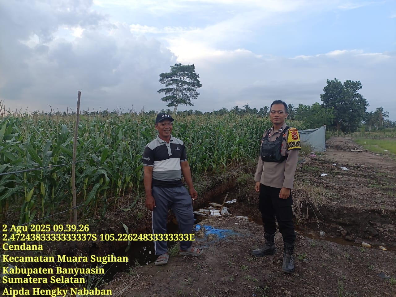 Banyuasin – Sukseskan Program Ketahanan Pangan Nasional Asta Cita Persiden RI, Bhabinkamtibmas Polsek Muara Padang Polsubsektor Muara Sugihan Aipda Hengky Pandapotan SH tinjau lahan pertanian jagung milik warga binaannya.