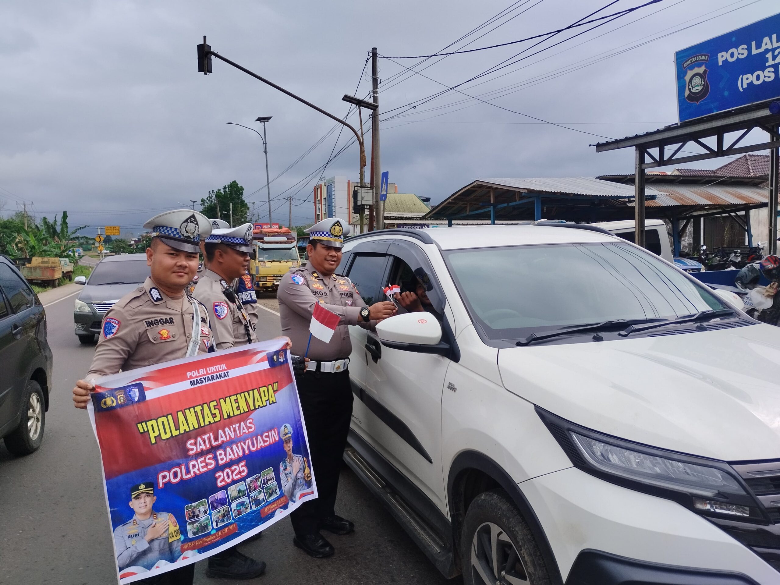 Banyuasin – Personil Satlantas Polres Banyuasin melakukan pemasangan bendera merah putih pada kendaraan dan melakukan Pembentangan Spanduk Polantas Menyapa kepada Komunitas Ojek Pangkalan, Sopir Kendaraan Pribadi, Sopir Angkot, dan Sopir Truck.