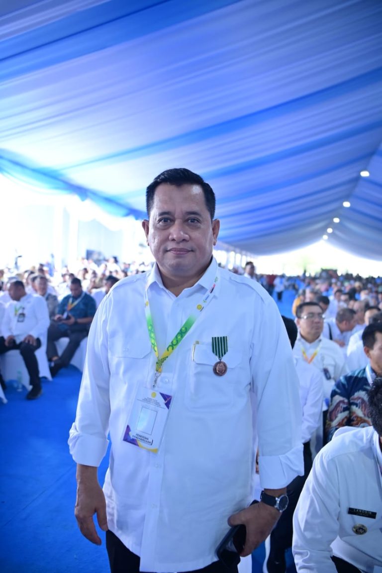 Bupati Banyuasin Dr H Askolani SH MH, yang hadir langsung juga dianugerahi Penghargaan Satyalencana Wira Karya sebagai atas jasanya yang besar di suatu bidang atau peristiwa tertentu yang bermanfaat bagi keselamatan kesejahteraan dan kebesaran bangsa dan negara.