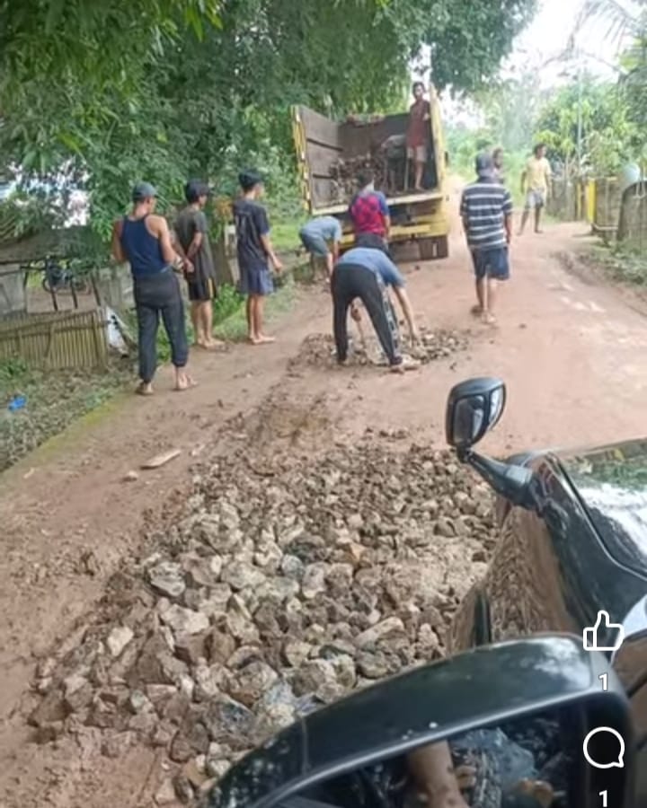 Banyuasin – Melihat kondisi jalan poros Desa Tebing Abang, Kecamatan Rantau Bayur, banyak berlubang dan membahayakan bagi pengendara, Kepala Desa Tebing Abang Nuhasim, berinisiatif melakukan penambalan menggunakan batu.
