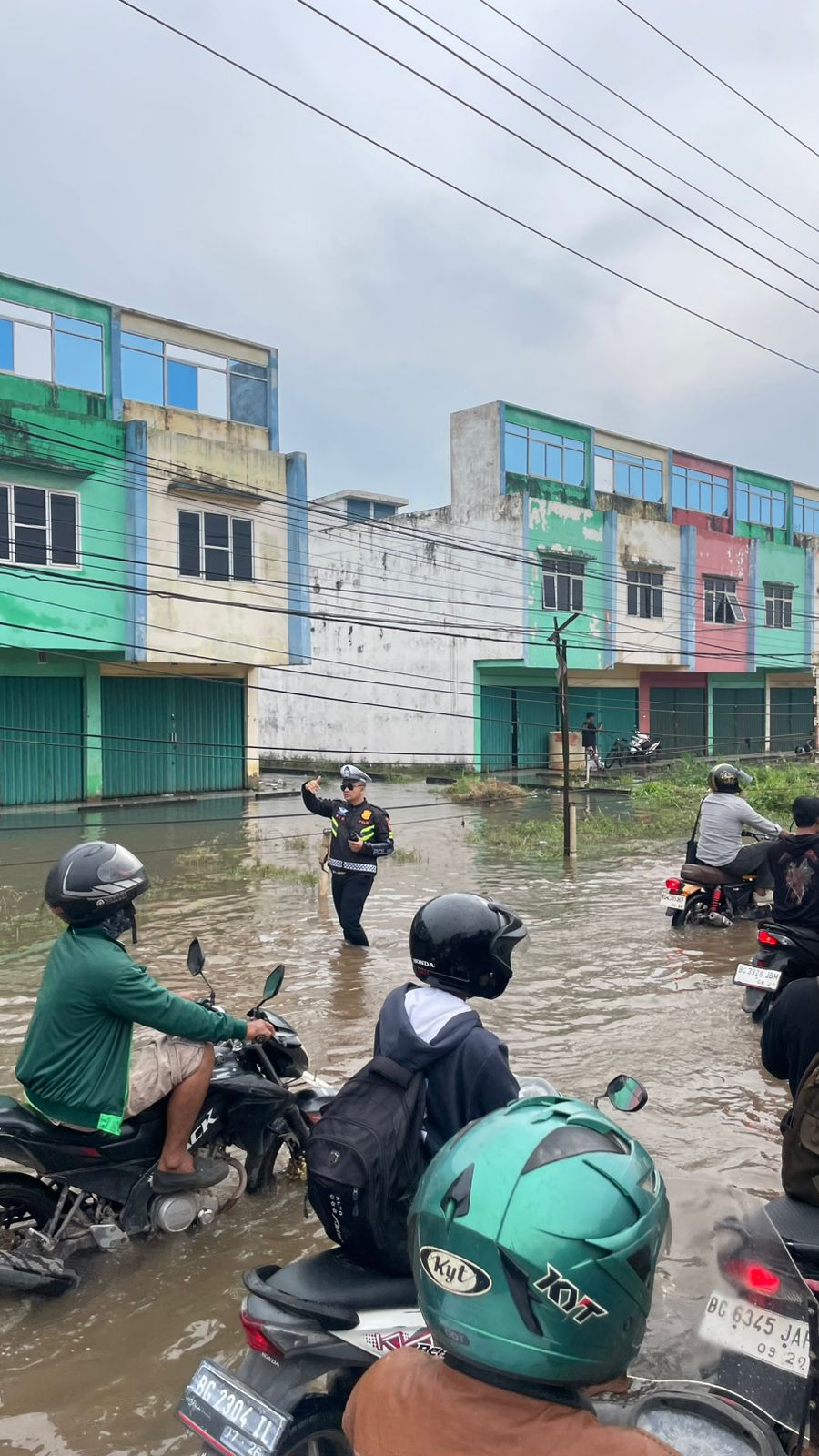 Tak hanya mengatur lalu lintas, personil yang bertugas juga sigap membantu masyarakat yang kendaraannya mogok akibat menerjang banjir. Beberapa sepeda motor terlihat didorong petugas ke tempat yang lebih aman dan kering.