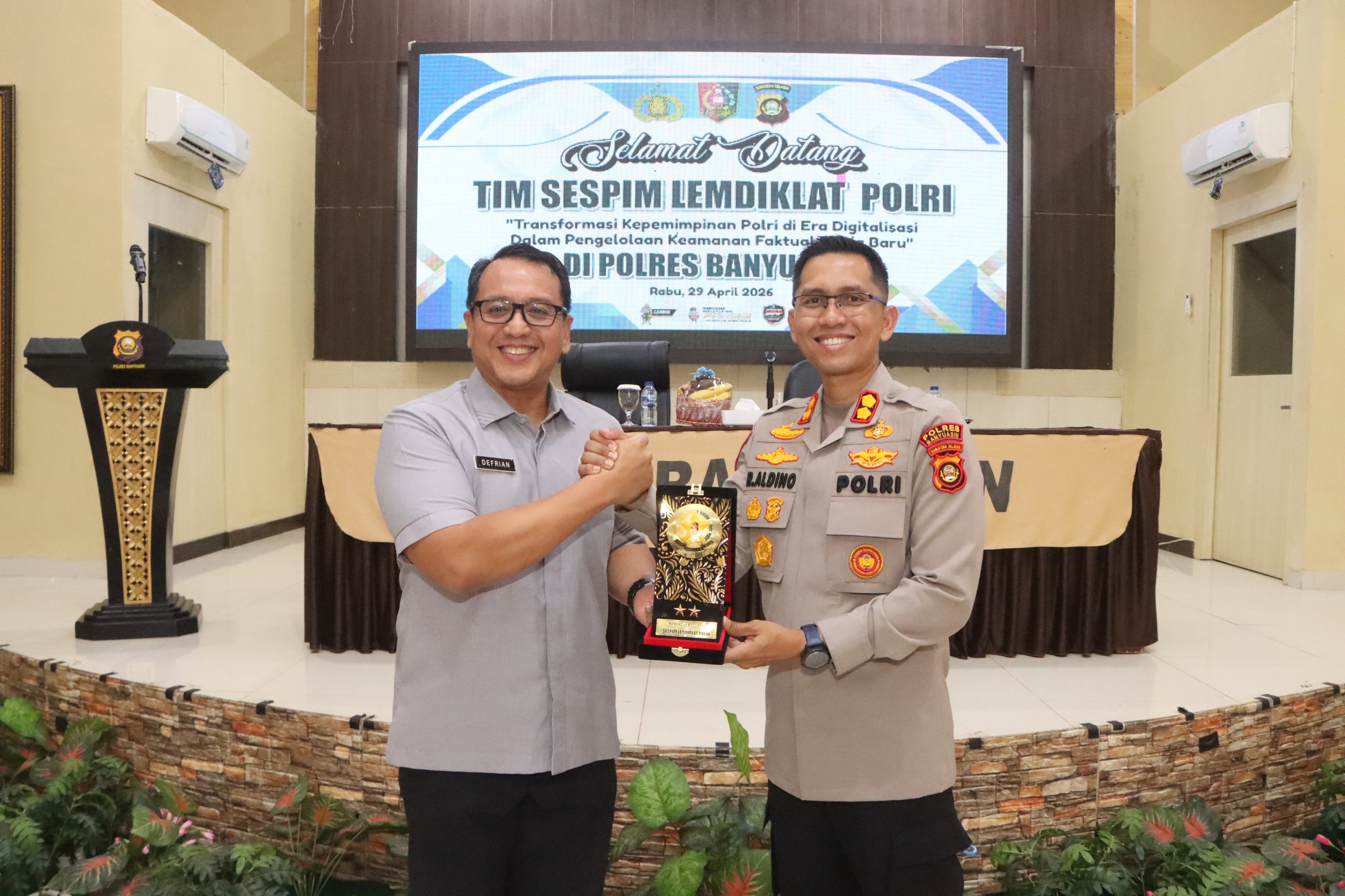 Puncak acara ditandai dengan pemberian plakat penghargaan dari Sespim Lemdiklat Polri kepada Kapolres Banyuasin, dilanjutkan dengan sesi foto bersama. Setelah itu, kegiatan berlanjut ke inti acara, yakni penyampaian materi dan diskusi interaktif (FGD) yang berlangsung hangat.